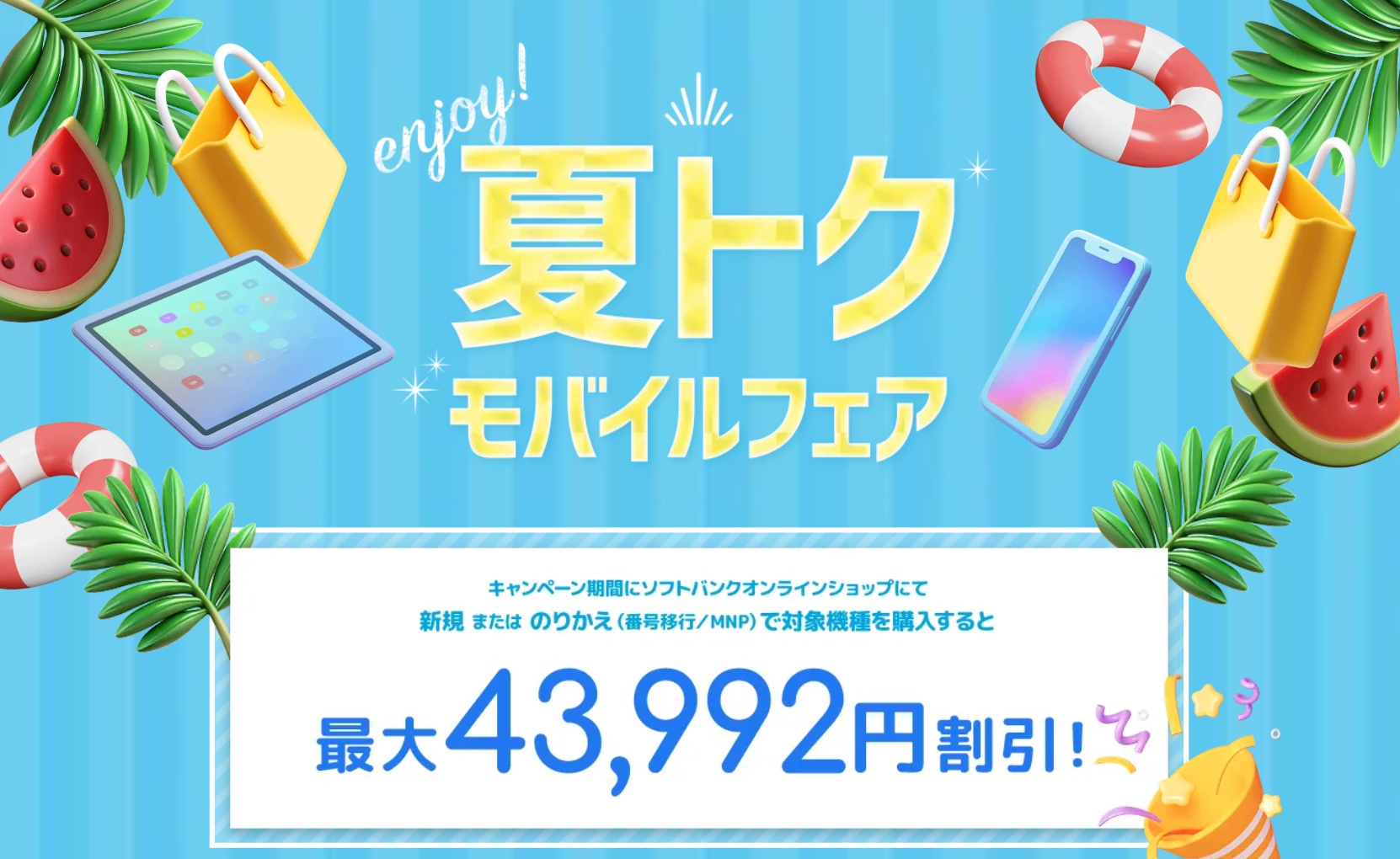 セール・キャンペーン 【終了しました】ソフトバンクで「夏トク モバイルフェア」開催!iPhone 16は月410円~、iPad(A16)は月300円~など